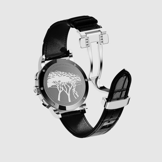 ケースバックにはコート・ダジュールを象徴する松の木の刻印を施し、フランス文化への敬意が込められている。