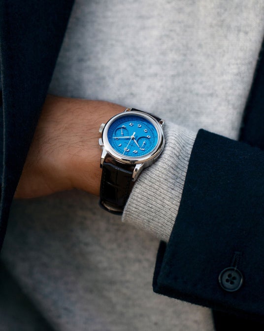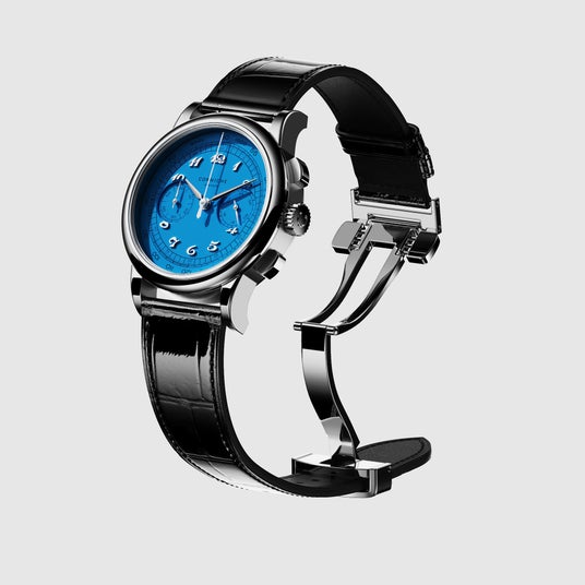 今回の第6弾では、コート・ダジュールの風景を彷彿とさせる色鮮やかなアズールブルーのセラミックダイヤルを採用し、光の角度によって豊かな表情を見せる。