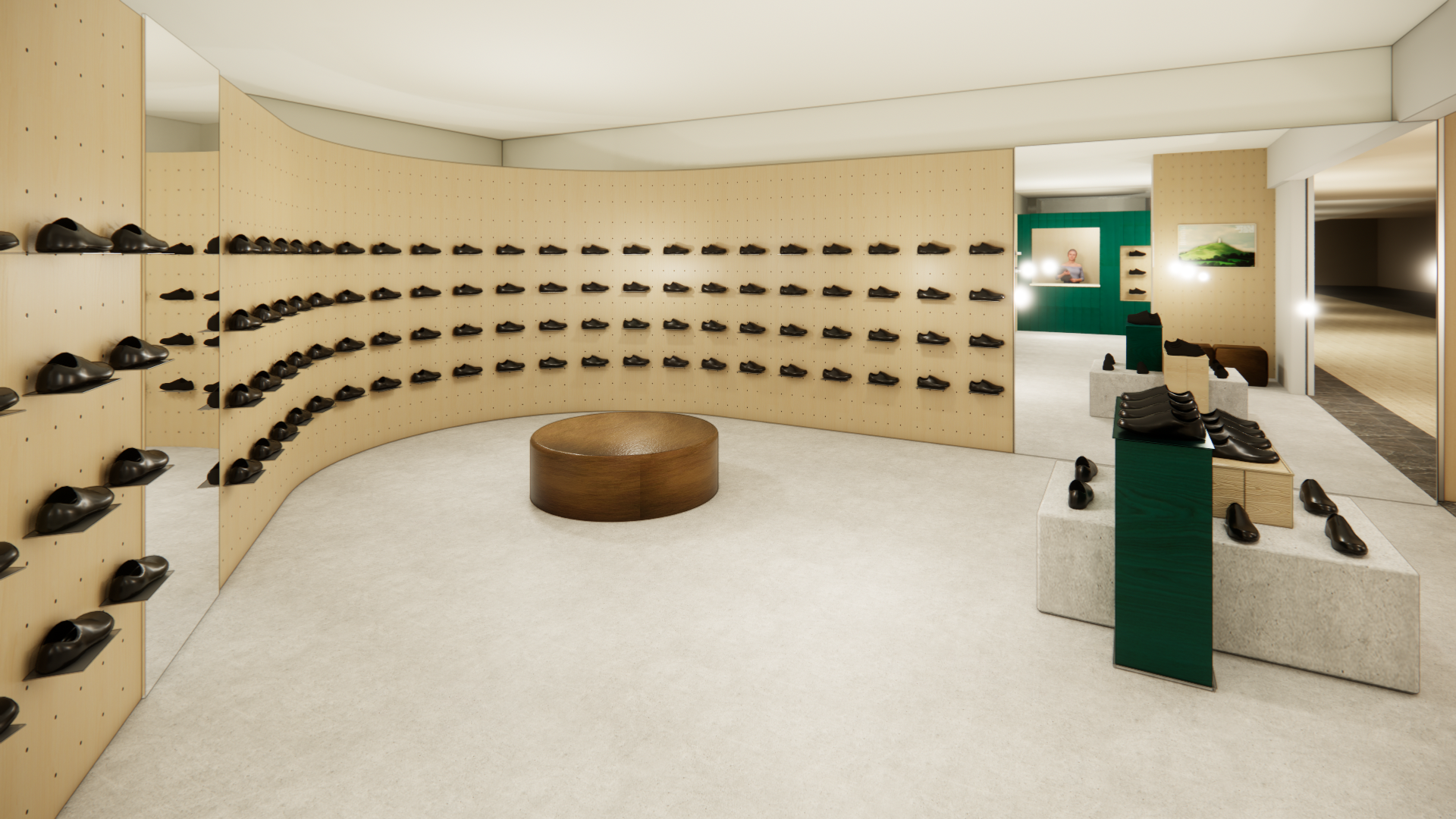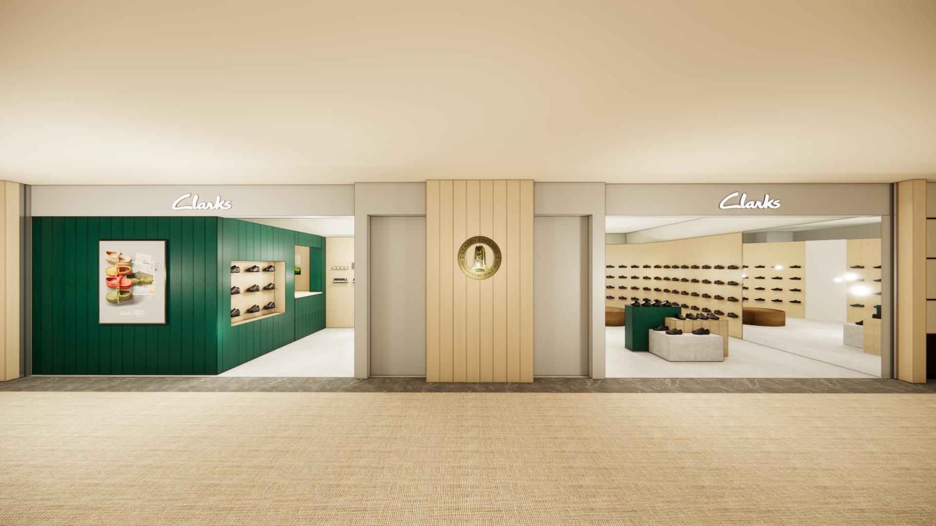 店内は、ブランドを象徴する“グリーン”をキーカラーに、温かみのあるウッド調の壁面を組み合わせた落ち着きのあるデザイン。大型ミラーとブラウンレザーのスツールを配し、シューズを中心とした洗練されたスタイリングを楽しめる空間を構築しています。またクラークスの哲学である「靴は『履く』ではなく、『包む』もの。」というメッセージを、柔らかなカーブを描く壁面アートで表現し、ブランドの世界観をより深く体感いただけます。