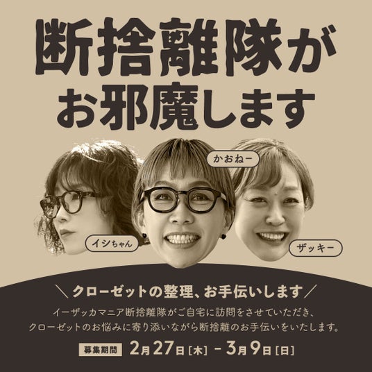 断捨離実施日程は、3月下旬~4月中旬。「さて、衣替えしなきゃ。」そんな季節にお伺いします。ぜひ「イーザッカマニア断捨離隊」とともに、スッキリと気持ちいい春を迎えてくださいね。
