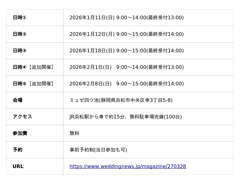 静岡県浜松市でブライダル事業を行う株式会社スティルアン(本社:静岡県浜松市中央区田町326-30、代表取締役社長:大石 奉樹)は、ミュゼ四ツ池にて開催している体験型イベント「浜松ウェディングフェスタ」において、2026年1月開催分に加え、好評につき2月1日(日)・2月8日(日)の追加開催を決定しました。本リリースでは、式場相談前にウェディングドレスの試着ができる体験コンテンツの詳細をお知らせいたします。
