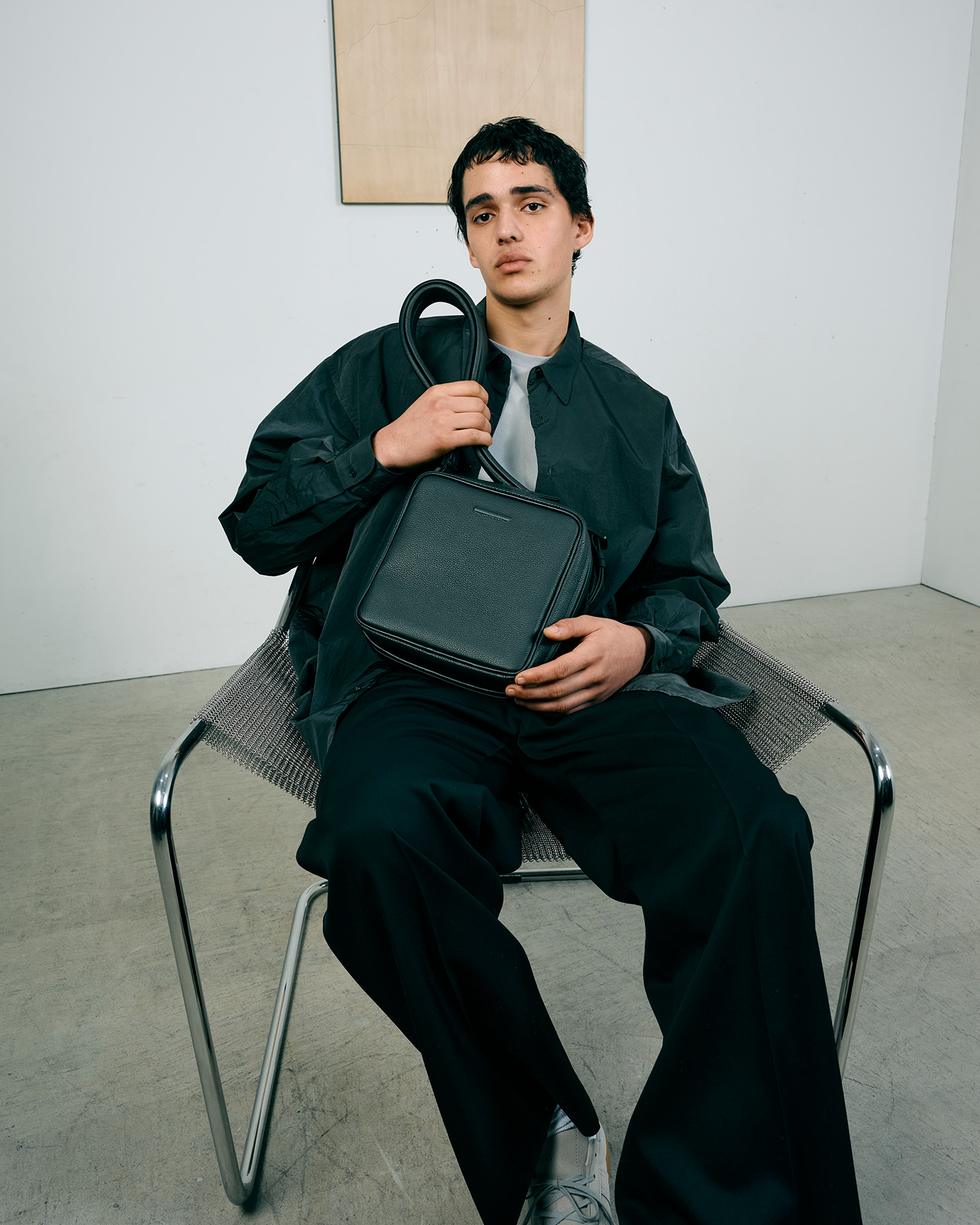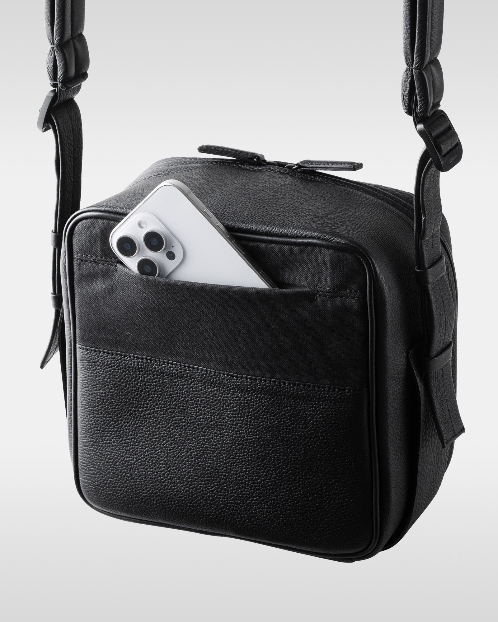 ボディとショルダーストラップには水や汚れに強い防水シュリンクレザーを採用。厚みのあるクッション入りストラップは、肩への負担を軽減すると同時に、存在感あるシルエットがスタイリングのアクセントにもなります。