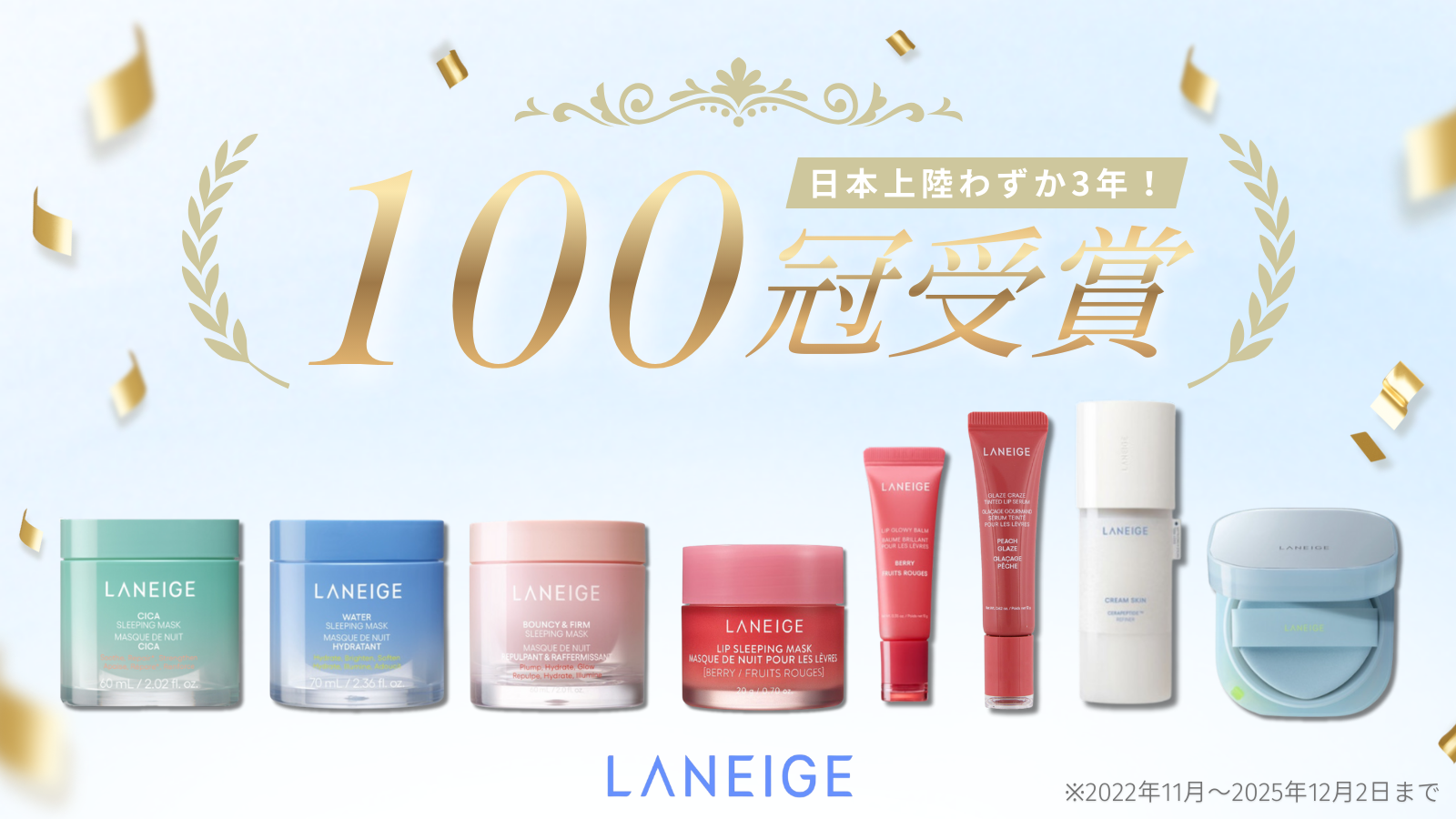アモーレパシフィックジャパン株式会社(所在地:東京都渋谷区、代表取締役:羅政均)が展開する韓国発のグローバルビューティーブランド「LANEIGE(ラネージュ)」(以下ラネージュ)は、2022年9月日本上陸からわずか3年で、ベストコスメ企画累計100冠*¹を達成いたしました。