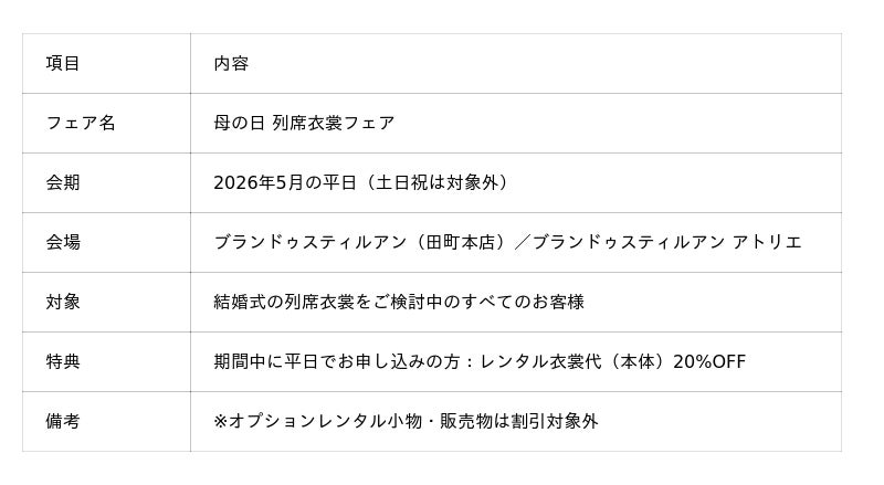 本フェアは、母の日の時期に合わせて、「大切な方の晴れの日に、自信を持った装いで列席していただきたい」という思いから企画いたしました。平日限定の開催により、スタイリストとじっくり相談しながら、ゆったりとした空間で衣裳をお選びいただける環境をご用意します。