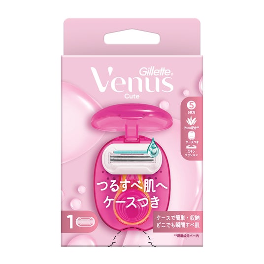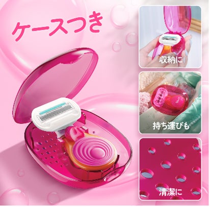 新商品「ヴィーナスつるすべ肌 ケース付ホルダー」は、ピンク色の可愛いケースに5枚刃搭載のカミソリを収納。しっかり剃るこができ、安心安全な収納と手軽な持ち運びを実現。使用した後に困る収納、置き場問題を解決するだけでなく、旅行先やお出かけ先にも持ち運びができるようになりました。見た目はコンパクトながらもお肌を保護するアロエ配合のグライドジェルが搭載されており、敏感肌の方にもやさしく、つるすべ肌を実現します。オフィスや学校、お出かけ先などへ持ち運ぶ際に、小ぶりなバッグにも収まる快適さです。