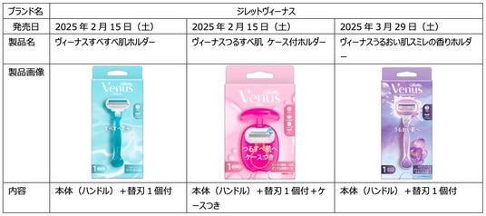 P&Gジャパン合同会社(本社:神戸市)は、世界売上 No.1*1女性用シェーブケアブランド「ジレットヴィーナス」より、簡単収納で持ち運びができるケース付きのカミソリ「ヴィーナスつるすべ肌 ケース付ホルダー」を2025年2月15日(土)より発売します。また、すべすべ肌&うるおい肌を実現する3枚刃モデル「ヴィーナスすべすべ肌ホルダー(2月15日発売)」と「ヴィーナスうるおい肌スミレの香りホルダー(3月29日発売)」も発売します。