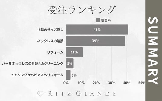 トップは「指輪のサイズ直し」で41%と、圧倒的な人気を誇っています。続いて「ネックレスの溶接」が39%と、ほぼ同等の需要を示しています。3位は「リフォーム」で11%、4位は「パールネックレスの糸換え&クリーニング」が5%となっています。