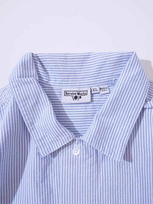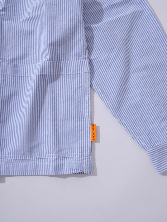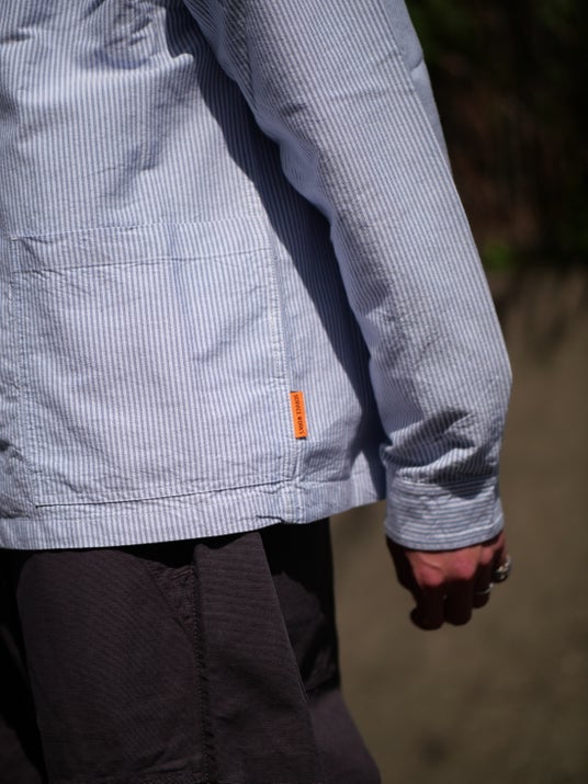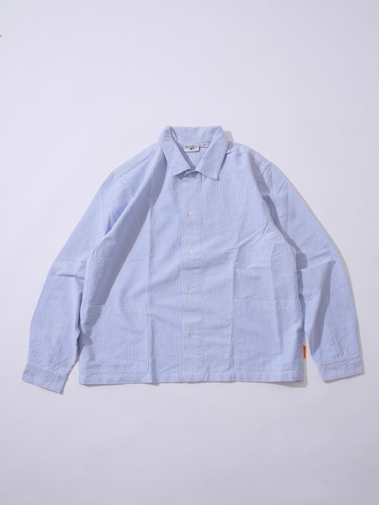 一見シンプルなブルーストライプシャツですが、フロント下部に配されたポケットがカバーオールのような表情をつくり出しています。
