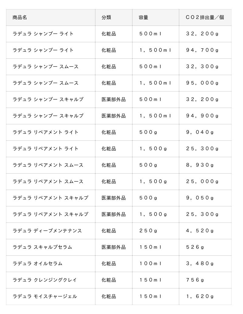 「ラデュラ」は、毛髪にハリコシを与えることで多くの大人女性が抱える悩み“髪のボリューム減少”を解消し、明るく自分らしく美髪を楽しんでいただくことを提案する理美容プロフェッショナル向けヘアケアブランドです。ヘアケア製品における算出は当社でも初の取り組みであり、これにより、理美容プロフェッショナル向け製品にも算出カテゴリーの範囲を拡大しました。