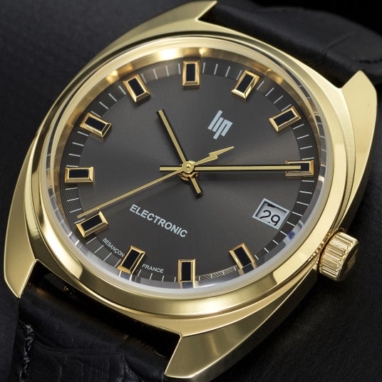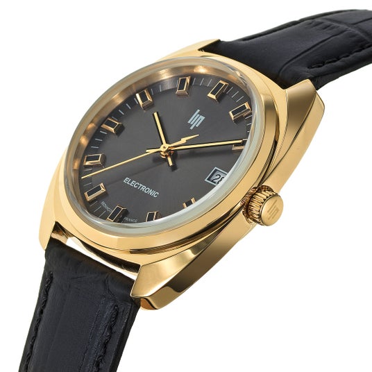 その精神を宿すタイムピースが、現代のスタイルに昇華されて蘇ります。ポリッシュ仕上げの35mmゴールドトーンケースに収まるのは、ガンメタリックのサンレイダイヤル。ブラックとゴールドのインデックスに、稲妻の尾を引く秒針。これはオリジナル電子モデルへの明確なオマージュであり、ミニマリズムと大胆さが共存する、唯一無二のデザインです。