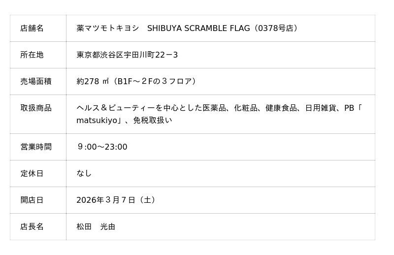 このたび、1995年にオープンし、「マツキヨ」の愛称で女子高校生をはじめ多くのお客様にご愛顧いただいた渋谷Part1店が全面改装し、3月7日(土)、新たな流行の発信基地「SHIBUYA SCRAMBLE FLAG」(シブヤ スクランブル フラッグ)として生まれ変わります。