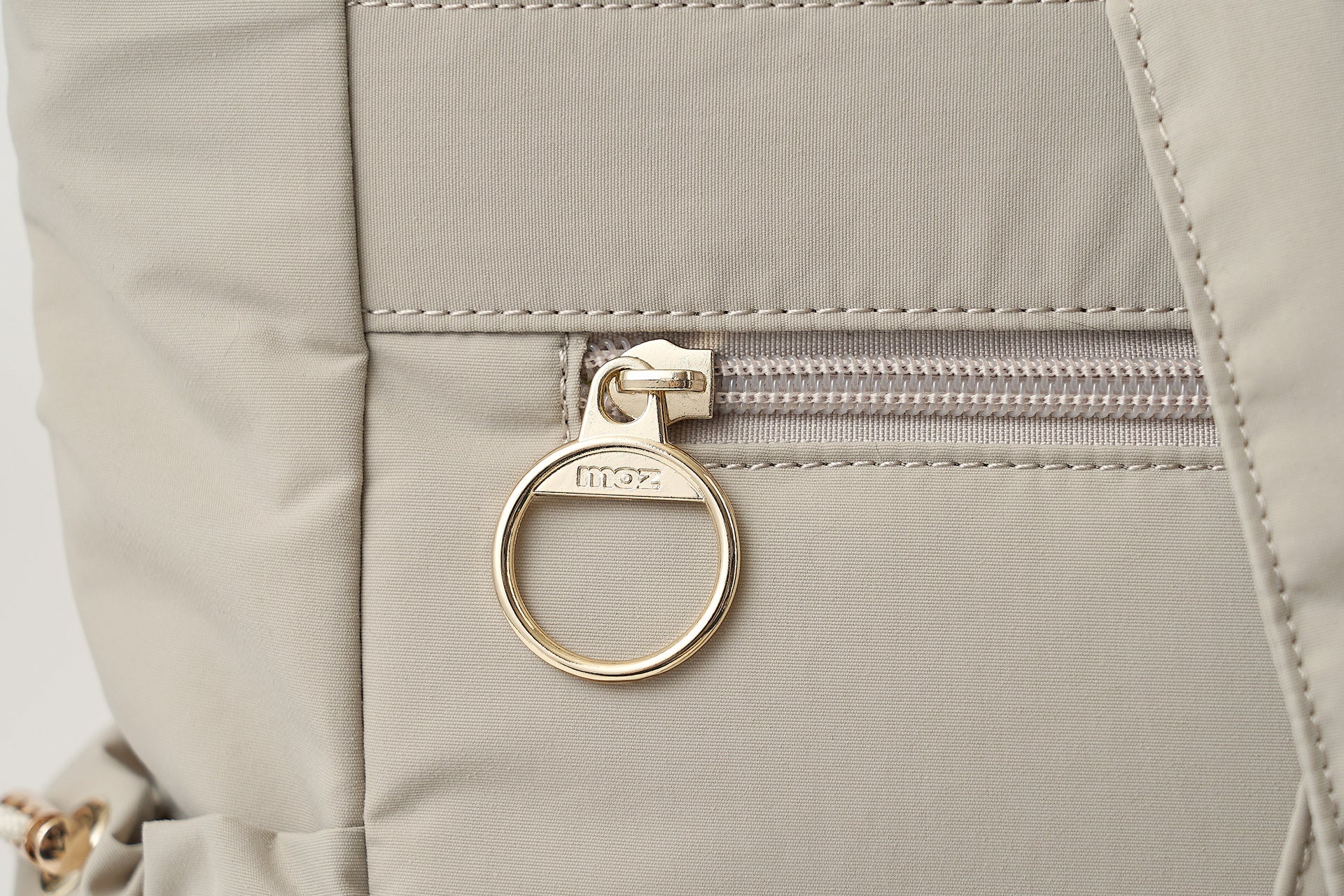 指をかけてスムーズに開閉しやすいリングタイプのファスナー引き手は、刻印されたmozのロゴがさりげなく輝き、使うたびにセンスを感じさせます。