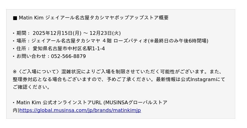 MUSINSA(ムシンサ)が日本国内で展開する韓国発ファッションブランド「Matin Kim(マーティンキム)」が、2025年12月15日(月)から12月23日(火)まで、ジェイアール名古屋タカシマヤ 4階 ポップアップスペースにてポップアップストアを開催いたします。