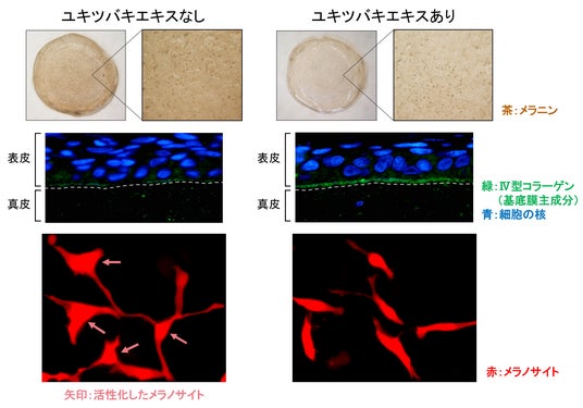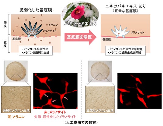 シミ部位の状態を再現した人工皮膚モデル(シミモデル)を作製し、このシミモデルにユキツバキエキスを添加すると、過剰なメラニン生成が抑制されることがわかりました(図3)。また、内部を観察すると、基底膜が正常化するとともに、メラノサイトの活性化も抑制されていました(図3)。このことからユキツバキエキスには、基底膜を正常化することでメラノサイトの活性化を抑え、過剰なメラニンの生成を抑制する効果があることがわかりました。