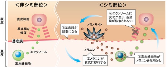 基底膜は、表皮と真皮の境として重要な役割を果たしています。これまでの研究から、一時的に基底膜が傷ついても、真皮幹細胞がエクソソーム※1を介して表皮細胞に働きかけ、修復を促すことがわかっています。さらに、シミ部位では、基底膜の脆弱化によって真皮にメラニンが移行し、このメラニンを真皮幹細胞が取り込むと、本来持っていた基底膜の修復機能が低下してしまうこともわかっています。つまり、シミ部位では、基底膜の修復が滞ってメラニンが真皮に移行し続けることで、さらに真皮幹細胞がメラニンを取り込み、ますます基底膜が修復できなくなるという負のスパイラルが生じています(図1)。