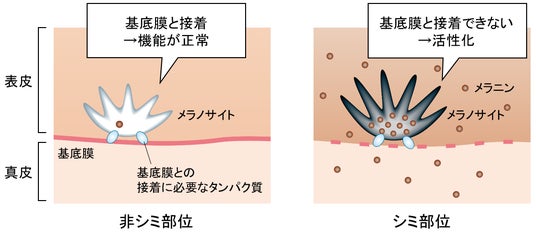 皮膚のシミは、紫外線の影響によりメラノサイトが活性化され、メラニンが過剰に生成されることで生じます。さらに、これまでの研究から、シミ部位でみられる基底膜の脆弱化もメラノサイトの活性化を引き起こすことが明らかになりました*。活性化したメラノサイトは、メラニンを過剰に生成するとともに、周囲の細胞へのメラニンの受け渡しも活発になっているため、シミ部位にメラニンを蓄積させてしまいます。