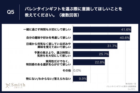 「Q5.バレンタインギフトを選ぶ際に意識してほしいことを教えてください。(複数回答)」(n=101)と質問したところ、「一緒に過ごす時間も大切にして欲しい」が41.6%、「自分の趣味や好みを考慮して欲しい」が40.6%、「日頃から何気なく話している好みや興味を覚えておいて欲しい」が31.7%という回答となりました。