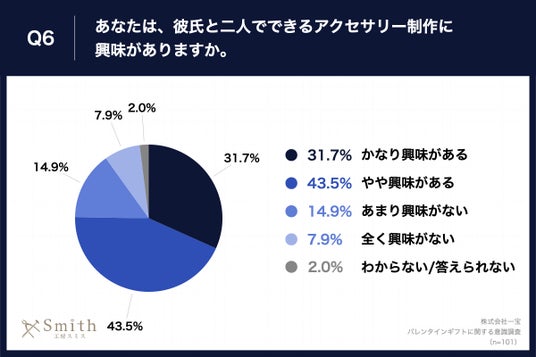 「Q6.あなたは、彼氏と二人でできるアクセサリー制作に興味がありますか。」(n=101)と質問したところ、「かなり興味がある」が31.7%、「やや興味がある」が43.5%という回答となりました。