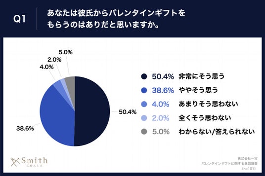 「Q1.あなたは彼氏からバレンタインギフトをもらうのはありだと思いますか。」(n=101)と質問したところ、「非常にそう思う」が50.4%、「ややそう思う」が38.6%という回答となりました。
