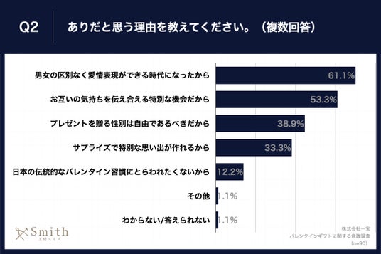 Q1で「非常にそう思う」「ややそう思う」と回答した方に、「Q2.ありだと思う理由を教えてください。(複数回答)」(n=90)と質問したところ、「男女の区別なく愛情表現ができる時代になったから」が61.1%、「お互いの気持ちを伝え合える特別な機会だから」が53.3%という回答となりました。
