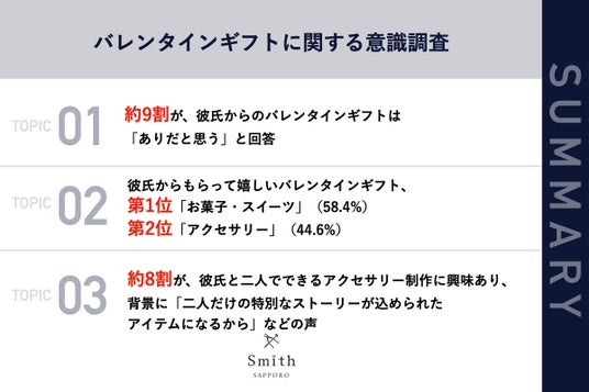 株式会社 一宝(本社:北海道札幌市、代表取締役:懸谷 正人)が運営する、手作り結婚指輪・婚約指輪・ペアリング専門店「工房Smith札幌」は、彼氏とバレンタインギフトを贈りあった経験のある北海道在住のZ世代(18~26歳)の女性101名を対象に、バレンタインギフトに関する意識調査を実施しましたので、お知らせいたします。