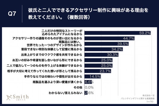Q6で「かなり興味がある」「やや興味がある」と回答した方に、「Q7.彼氏と二人でできるアクセサリー制作に興味がある理由を教えてください。(複数回答)」(n=76)と質問したところ、「二人だけの特別なストーリーが込められたアイテムになるから」が59.2%、「アクセサリー作りの過程そのものが思い出になるから」が44.7%という回答となりました。