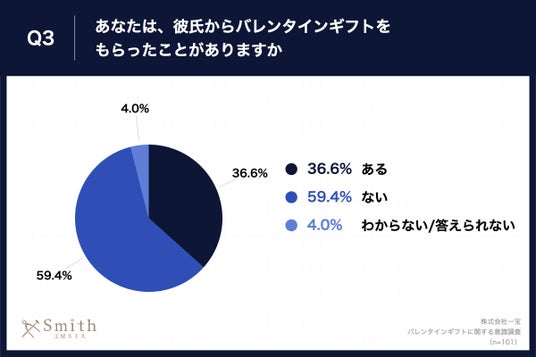 「Q3.あなたは、彼氏からバレンタインギフトをもらったことがありますか。」(n=101)と質問したところ、「ある」が36.6%、「ない」が59.4%という回答となりました。