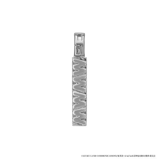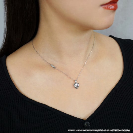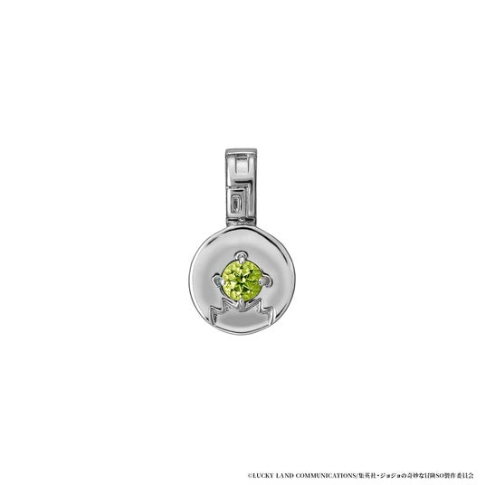 中央には空条徐倫の瞳のカラーをイメージした鮮やかなグリーンクォーツをセッティング。胸元のハートデザインに星の痣やスタンドの糸を取り入れデザインしました。裏側は愛称の『JOJO』を糸で描いたイメージで仕上げています。