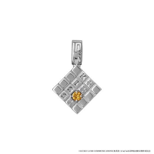アニメ『ジョジョの奇妙な冒険 ストーンオーシャン』のキャラクターとスタンドを表現したネックレスチャーム。共通デザインとして、空条徐倫のベルトのバックルをバチカンにデザインしました。各キャラクターをイメージした天然石をセッティングし、表と裏で異なる表情を楽しめるリバーシブル仕様にもなっています。それぞれサイズや形を変えたバリエーション豊かなラインナップなので、お好きな組み合わせで自由にコーディネートが可能です。別売りの『JOJO★』刻印入りチェーンネックレスと合わせると、より一層『ジョジョの奇妙な冒険』の世界を肌で感じて頂けます。