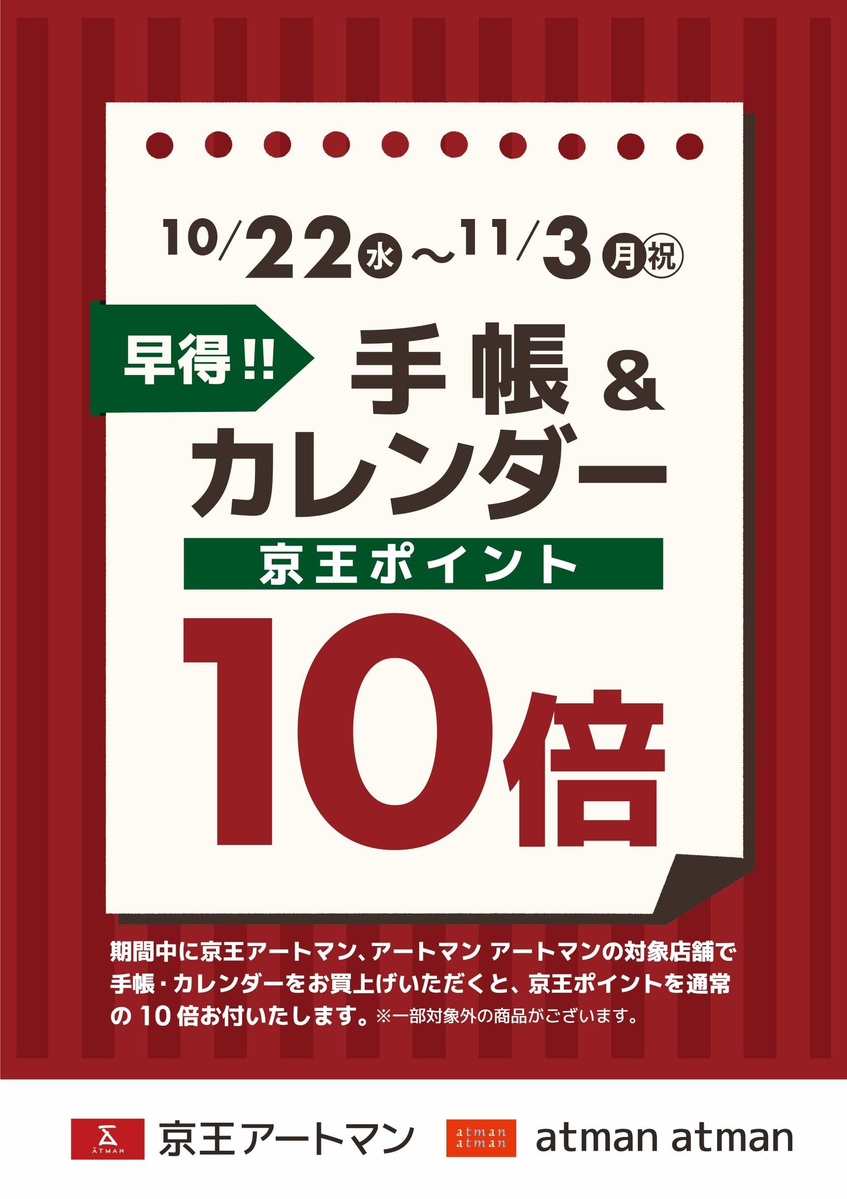 京王グループでコスメを中心に生活雑貨を販売する株式会社京王アートマン(本社:東京都多摩市、以下 京王アートマン)は、2025年10月22日(水)から2025年11月3日(月祝)まで京王アートマン・アートマン アートマンの対象店舗にて「手帳&カレンダー 京王ポイント10倍」を開催いたします。