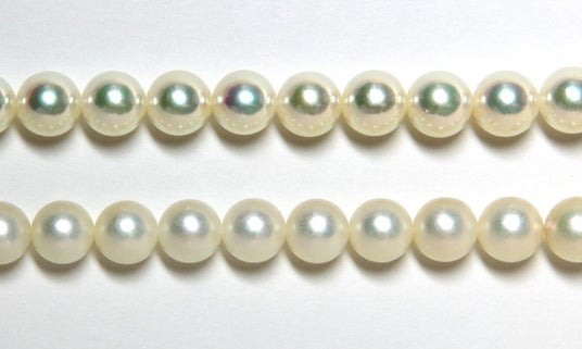 パールリフレッシャーによるパールクリーニングのビフォー(下)アフター(上)