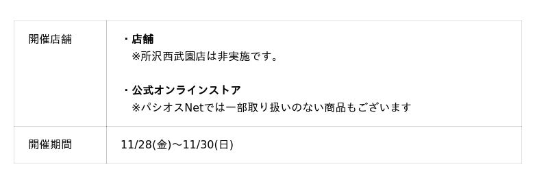 株式会社田原屋(本社所在地:神奈川県川崎市、代表取締役会長:田熊 太郎、代表取締役社長:甲斐 直裕)は、11/28(金)よりファッションプラザ【パシオス】で「BLACK FRIDAY Sale」を開催いたします。