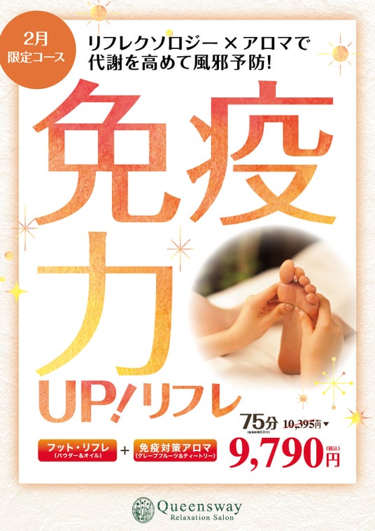このたび、Queenswayが2025年2月限定として、リフレクソロジー×アロマで代謝を高めることにより、風邪などの病気の予防を図る「免疫力UP!リフレ」を提供いたします。