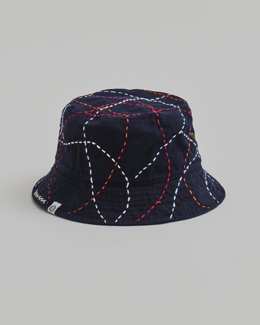 KUON×SASHIKO GAILSからキャップとバケットハットをJAPAN EDITION使用に別注。ベーシックな形に対して、日本の伝統技術を用いてアイキャッチーにした製品です。1点1点刺子のお色や幅のムラが異なる1点ものです。