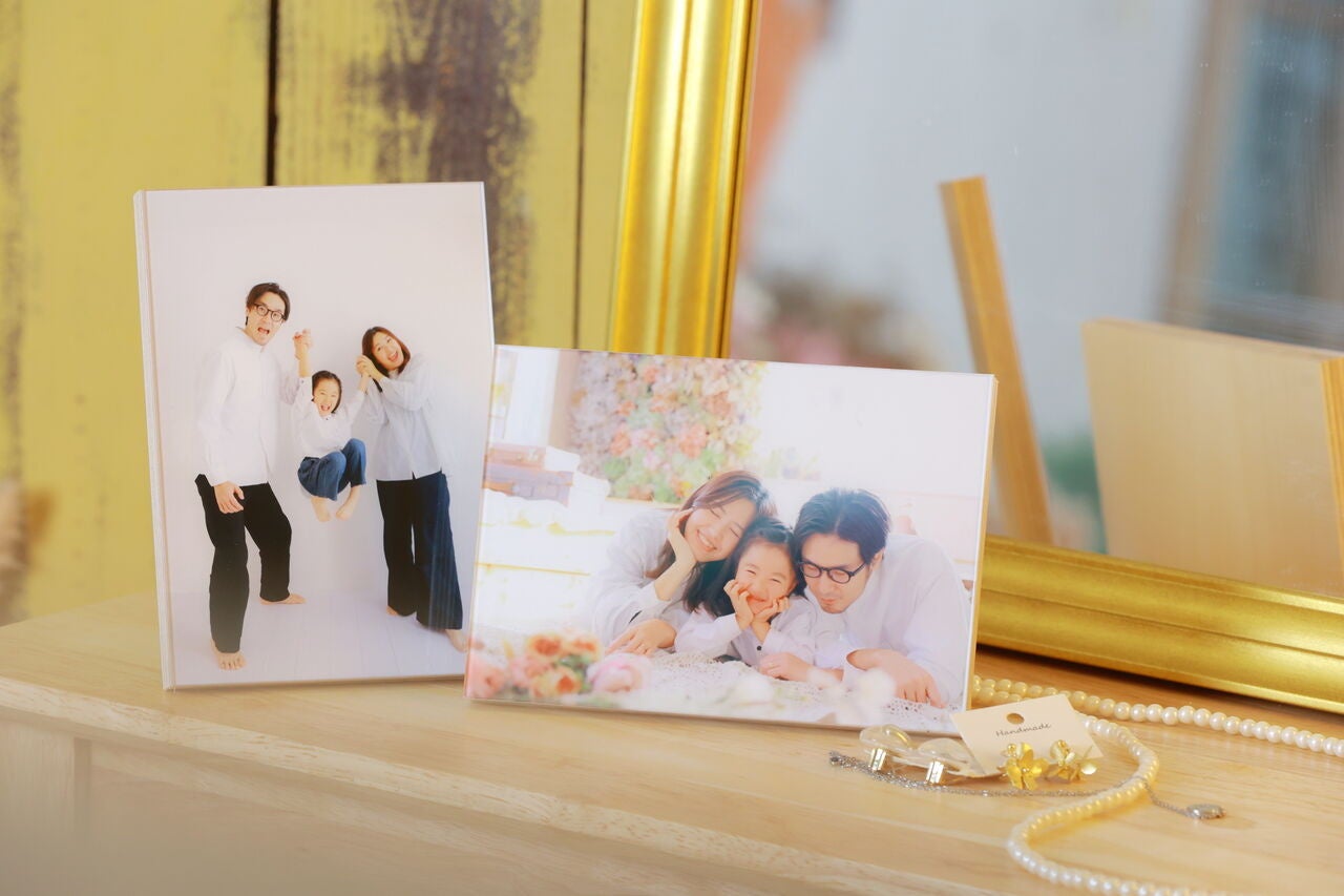 撮影当日にお撮りした写真からカメラマンがセレクトした1枚を、2Lサイズのアクリル×木製フレームにセットし、その場でお渡し。