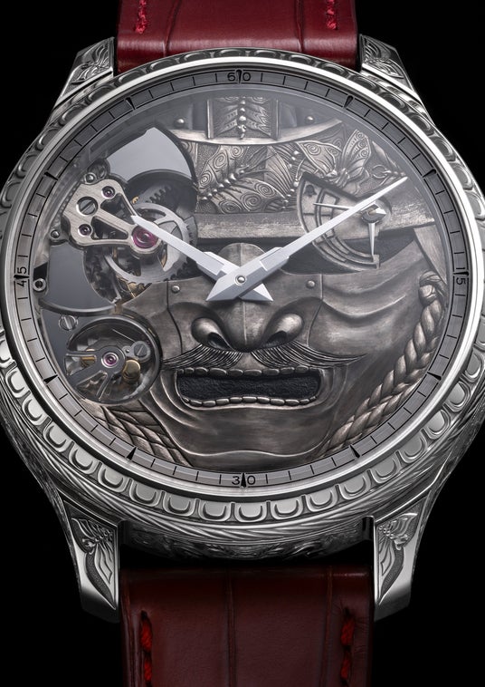 最初に紹介するのは、「L.U.C フル ストライク」のユニークピース。武士の世界観とその規範となる道徳観にインスピレーションを得たこのタイムピースは、一つひとつの手彫りのディテール装飾が物語を紡ぐ、豊かな表現を湛えた芸術的クリエイションです。「L.U.C フル ストライク スピリット オブ ザ・ウォリアー」に搭載されたミニッツリピータームーブメント「L.U.C 08.01-L」にも、手彫りによる装飾が施され、比類なきクリスタルクリアな音色を奏でます。その卓越した職人技と仕上げの美しさは、誉れ高いジュネーブ・シールの品質認証によって裏打ちされています。