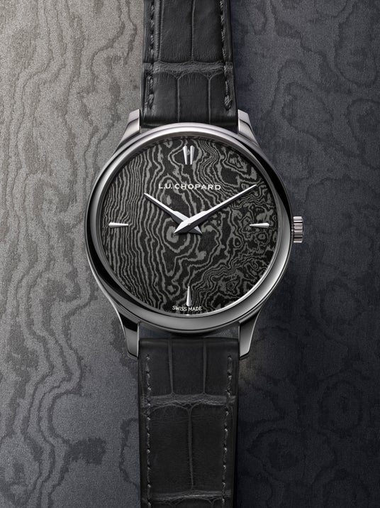 日本の伝統的なクラフツマンシップの真髄を探求し続け、今回発表された「L.U.C XP 日本刀」は、25本の限定エディション。文字盤は、日本刀の“聖なる鋼”である「玉鋼(たまはがね)」から着想を得た技法を用い、ダマスカス鋼から職人の手によって丹念に作り上げられています。120~160層の鋼板を重ねて制作された唯一無二の文字盤は、炎の揺らめきを想起させるモアレ模様が浮かび上がり、無常観を説く禅の哲学を映し出しています。その洗練された美学は、22Kゴールド製マイクロローターと65時間のパワーリザーブを備えた超薄型ムーブメント「L.U.C 96.41-L」の高い精度によって、さらに研ぎ澄まされています。権威あるジュネーブ・シールの品質認証を取得した「L.U.C XP 日本刀」は、伝統的なクラフツマンシップと現代の革新性が融合した稀有な芸術作品です。