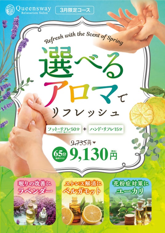 このたび、Queenswayが2025年3月限定として、「選べるアロマでリフレッシュ」と題しまして、手足をほぐすと共に、お悩みに合わせたアロマを選択することで睡眠へのお悩み、ストレス解消、花粉症対策などにアプローチする内容のコースをご提供いたします。