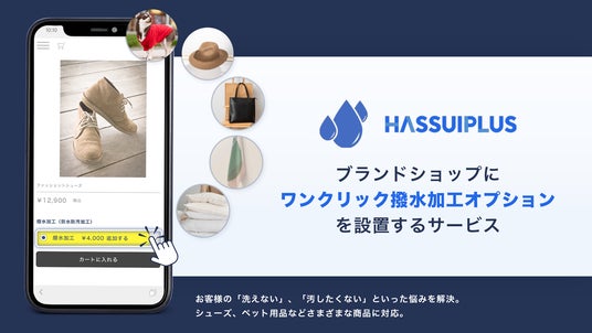 「Hassui Plus」は、ブランドオンラインショップに「非フッ素撥水加工」のオプションを設置し、一般のお客様はワンクリックで撥水加工を依頼できるサービスです。ショップ側は撥水加工サービスを提供でき、収益性と顧客満足度の向上が期待できます。 一般のお客様は撥水加工をオプション注文することで、商品を長く使うことができます。