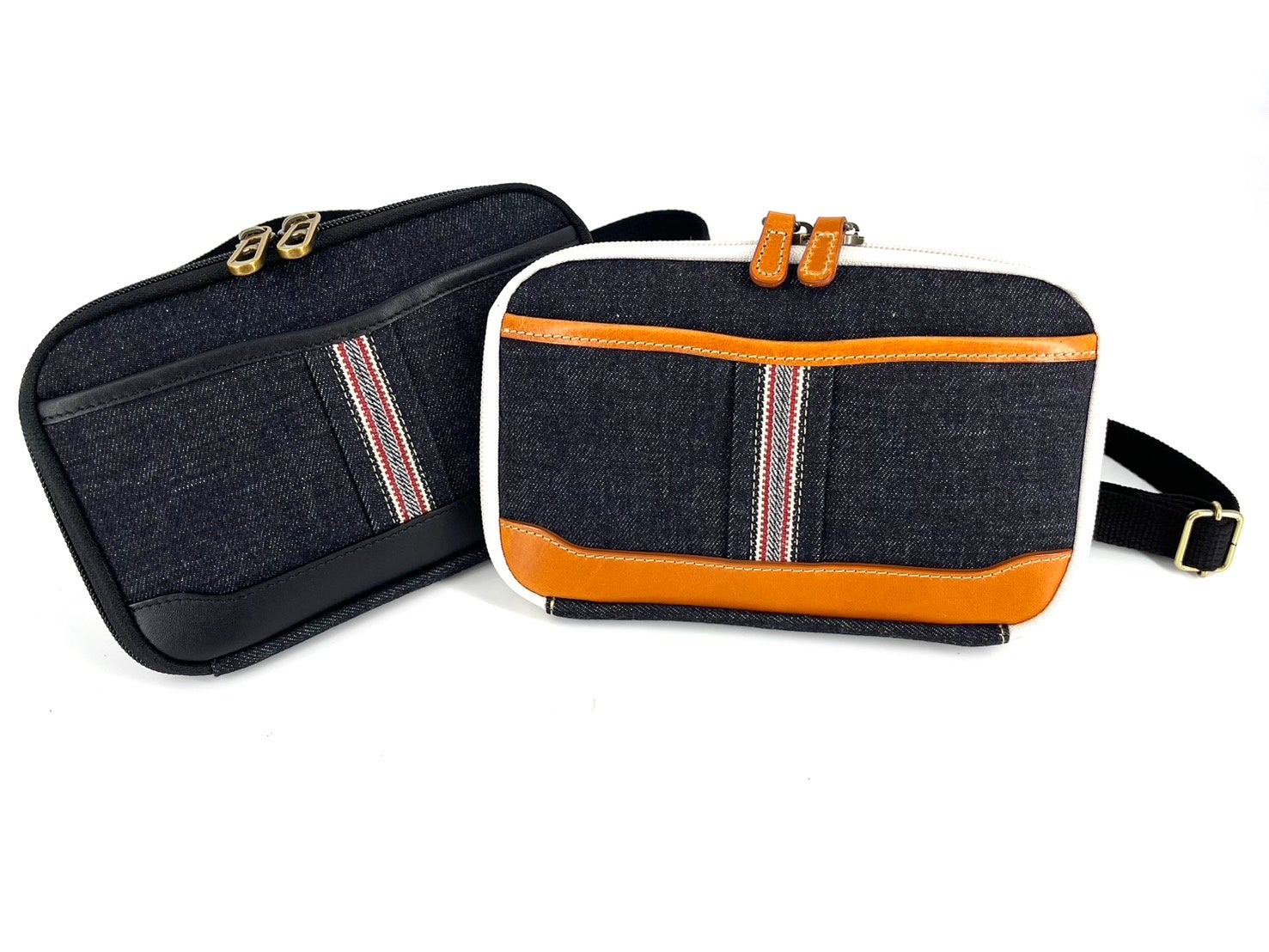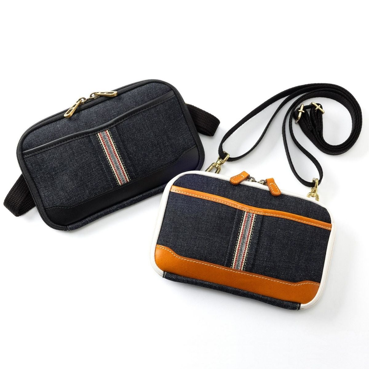 地域ブランド「井原デニム」のセルビッジデニムの赤耳をセンターに配したデザイン。内装にオープンポケット、ファスナーポケット、カード入れを備え、お財布のように使えるショルダーポーチです。