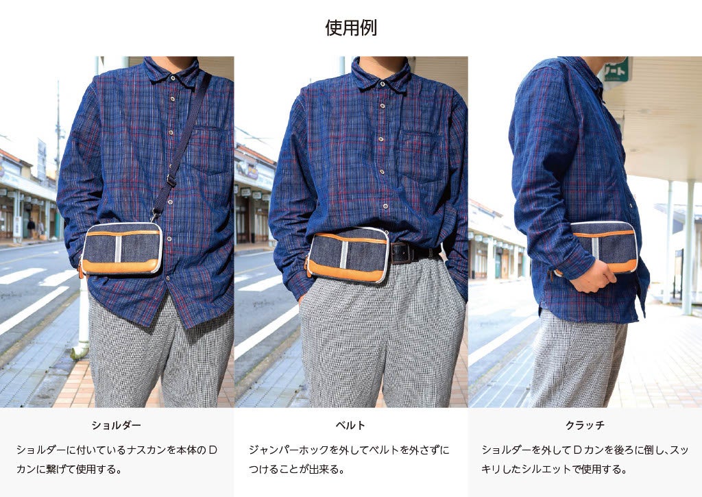この鞄のポイントは、スマホ+携帯小物のみ収納できるミニポーチを3つのスタイルで使い分けできるところです。中でも背面のホックを外し、アウターのパンツのベルトにそのまま取り付けできる点が特長です。また、鞄を横型にすることで小銭やお札の視認性を良くし、椅子に座るときも邪魔になりにくいように考えられています。