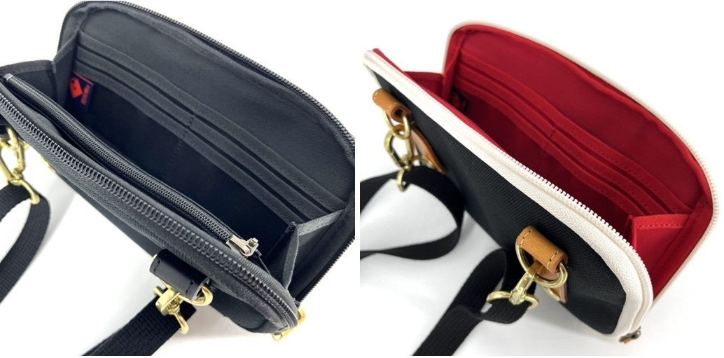 どちらのカラーも本体背胴側とショルダーベルトに黒の綿生地を使用し、ベルト周辺の金具はゴールドで統一しています。