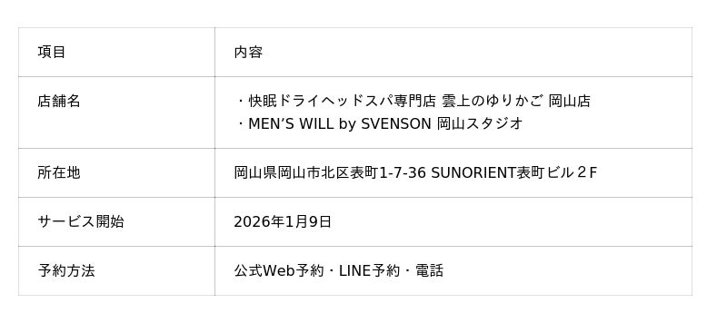 脳疲労・眼精疲労からくる睡眠課題にアプローチするリラクゼーションブランドを運営する雲上のゆりかご株式会社(所在地:東京都中央区、代表取締役 宇佐美達也/宗像良祐/広瀬久也)と、薄毛対策や予防などの頭皮ケアまで幅広く対応する毛髪のプロフェッショナルサロンを運営する株式会社スヴェンソン(所在地:東京都港区、代表取締役社長CEO 児玉義則)メンズ事業部がタッグを組み、“眠り・血流・頭皮環境” をワンストップで整える新コンセプトサービス を 2026年1月9日(金)に岡山県で開始します。
