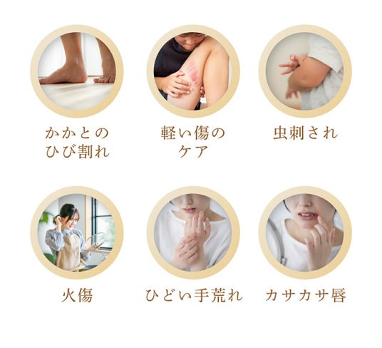 乾燥する冬の保湿、夏の虫刺され後のケア、軽い怪我、手作業が多いキャンプなどのアウトドアやスポーツに。