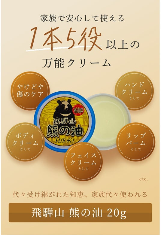 古来よりマタギや地元の人々に重宝されてきた奥飛騨の熊の油を使用したこの保湿バームは、化学薬品を一切使わず、天然成分のみで作られた安心のスキンケア製品です。
