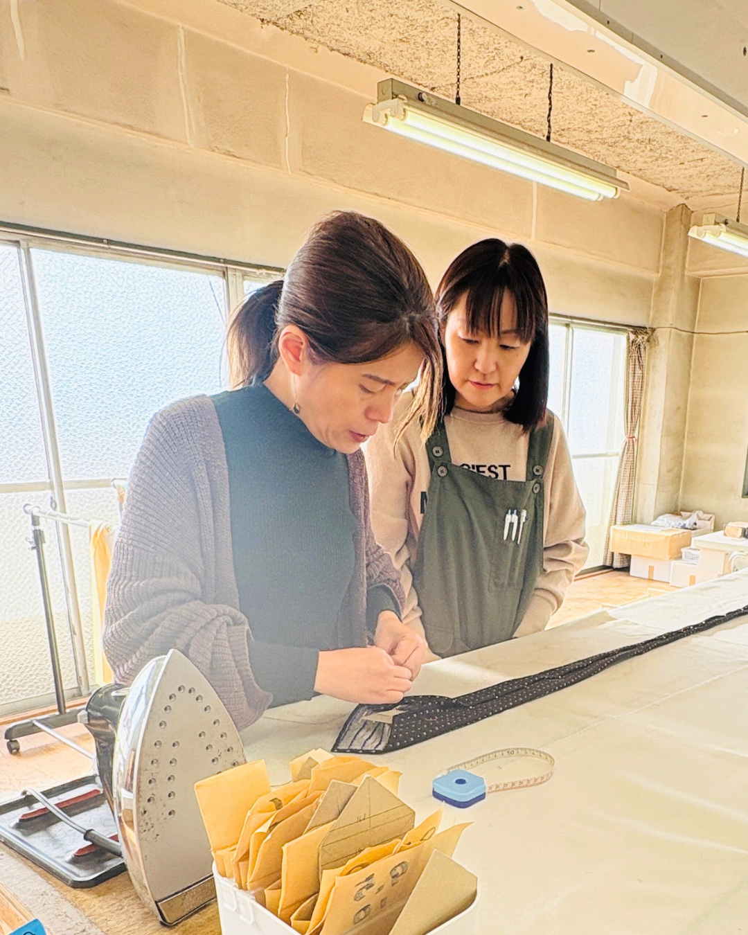 1. 五感で感じる工房体験 親子で工房を訪れ、生地の選定から採寸、刺繍オプションまで体験。オーダールームは学生寮として使用されていた建物を改修した設備。その場で、布の手触り、糸の輝き、職人の息づかいを五感で感じることで、モノづくりの過程の体験そのものが家族の記憶となります。