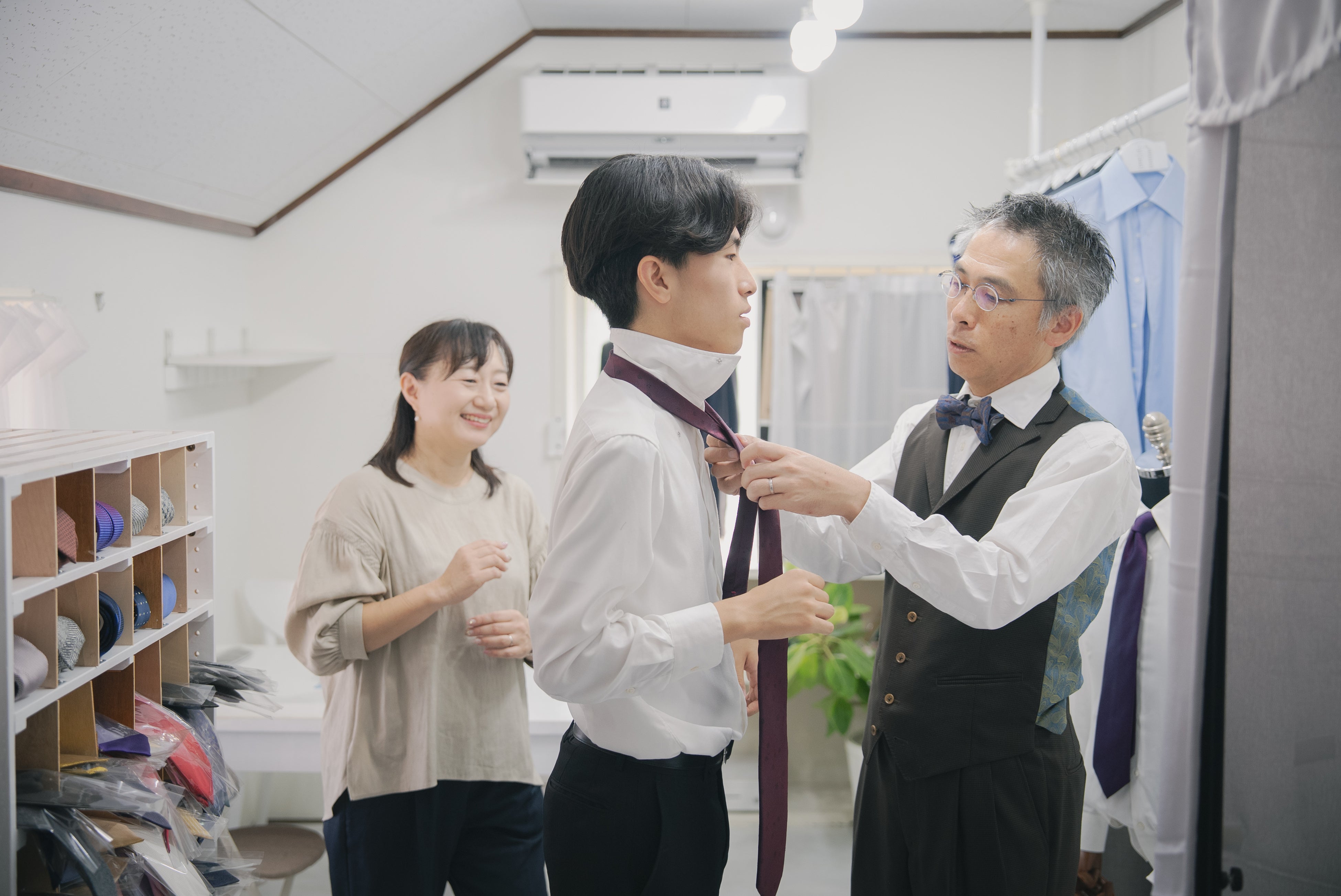 3. 記憶に残る演出サービス 多くの若者の巣立ちを見守った場所で、親が子にネクタイを結ぶ瞬間の演出、メッセージ刺繍入り、記念撮影、メッセージカードなど、「記念日の記憶」を形にするサービスを提供。日本の新しい贈り物文化を創造するサービスです。