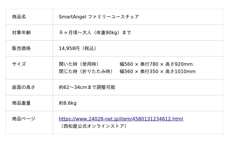 株式会社西松屋チェーン(兵庫県姫路市、代表取締役社長 大村 浩一)は、生後6ヶ月頃から大人まで、ご家族みんなで長くご愛用いただける「SmartAngel ファミリーユースチェア」を、全国の当社店舗および「西松屋公式オンラインストア」にて販売開始いたします。