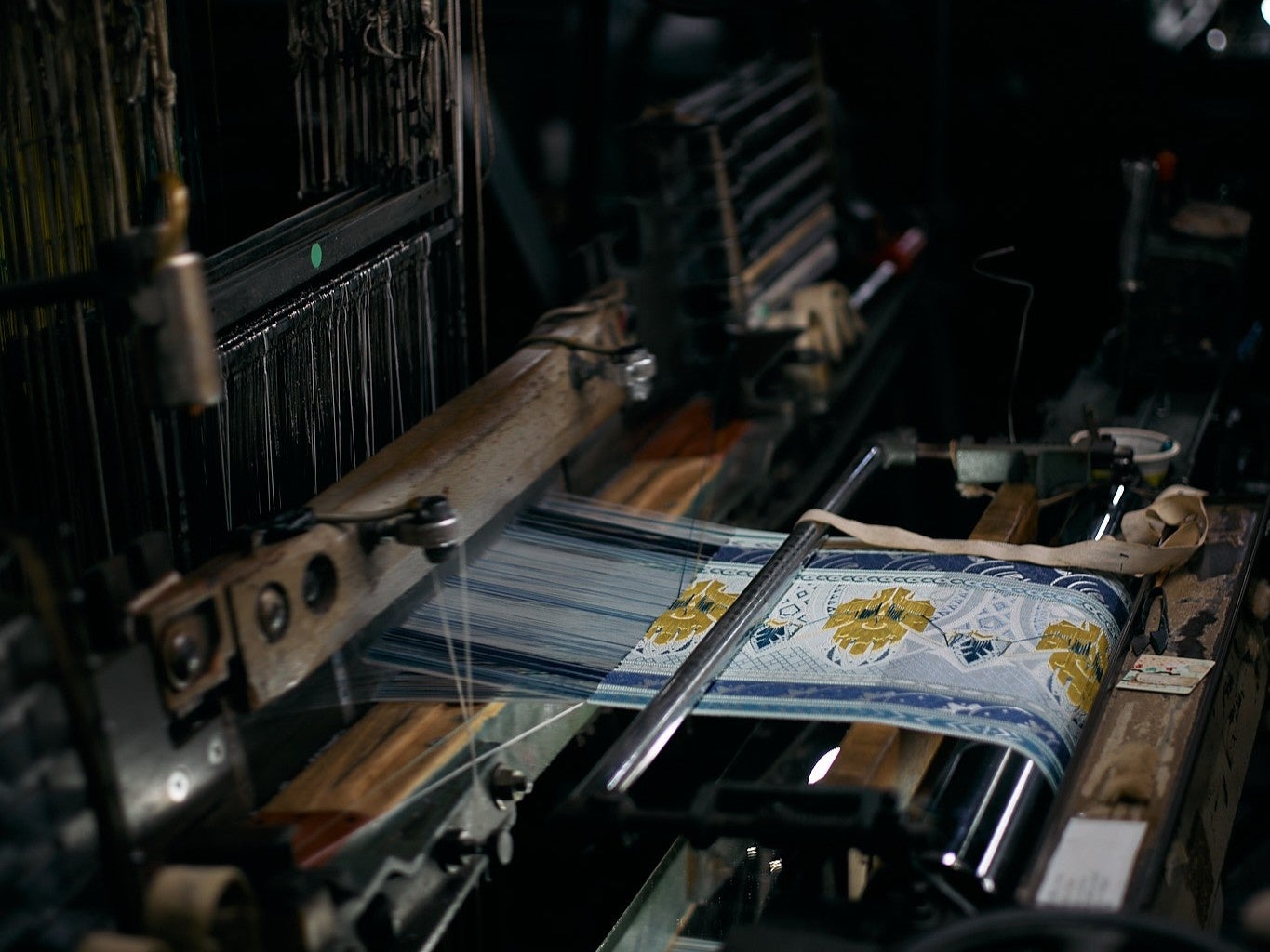 博多織の帯を織る過程で生まれるハギレを、新たな布として再構成。