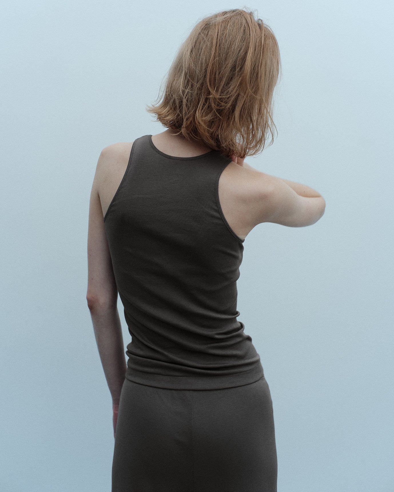 曽根英理菜氏は、ブランドの持つ製造過程を美しく可視化することを目指し、素材が持つ美しさを最大限に引き出すため、デザインにおいても“引き算の美”を意識。ミニマルでベーシックなアイテムながらも、繊細なネックラインや立体的なフォルムによって、女性の身体をしなやかに美しく際立たせます。また、肌に心地よくなじむカラーパレットを揃えることで、マチュアな女性像を力強く描き出しました。